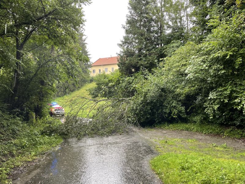 Ein Baum war umgestürzt und blockierte die Fahrbahn. Er wurde mittels Kettensäge beseitigt.