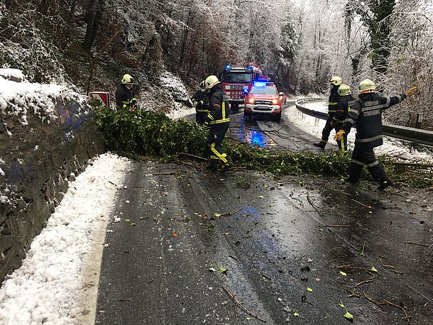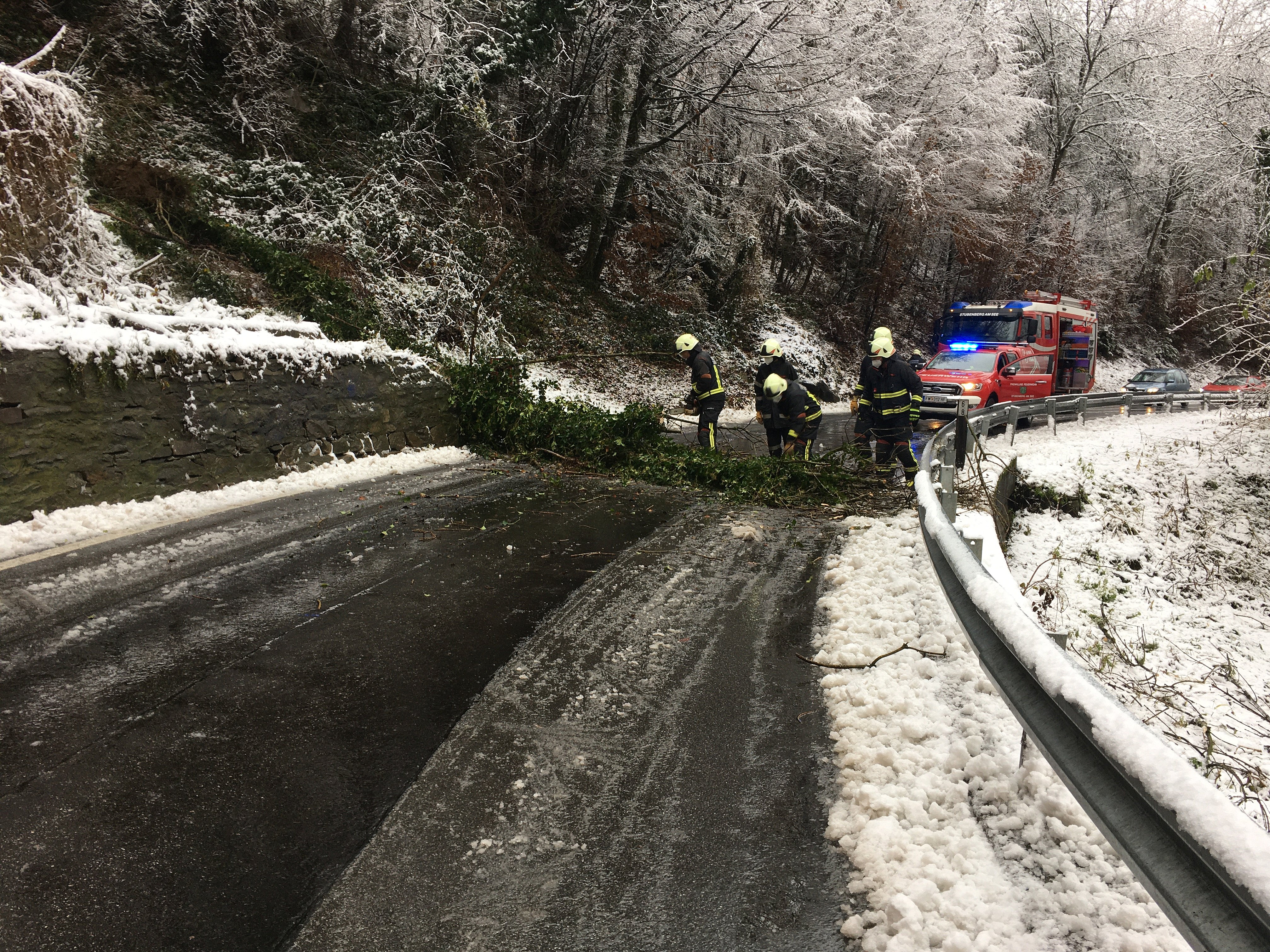 Der erneute Schneefall am 28.11.2021 sorgte für einen weiteren Einsatz: ein Baum war in der Stubenbergklamm umgestürzt, die L409 war in diesem Bereich blockiert.