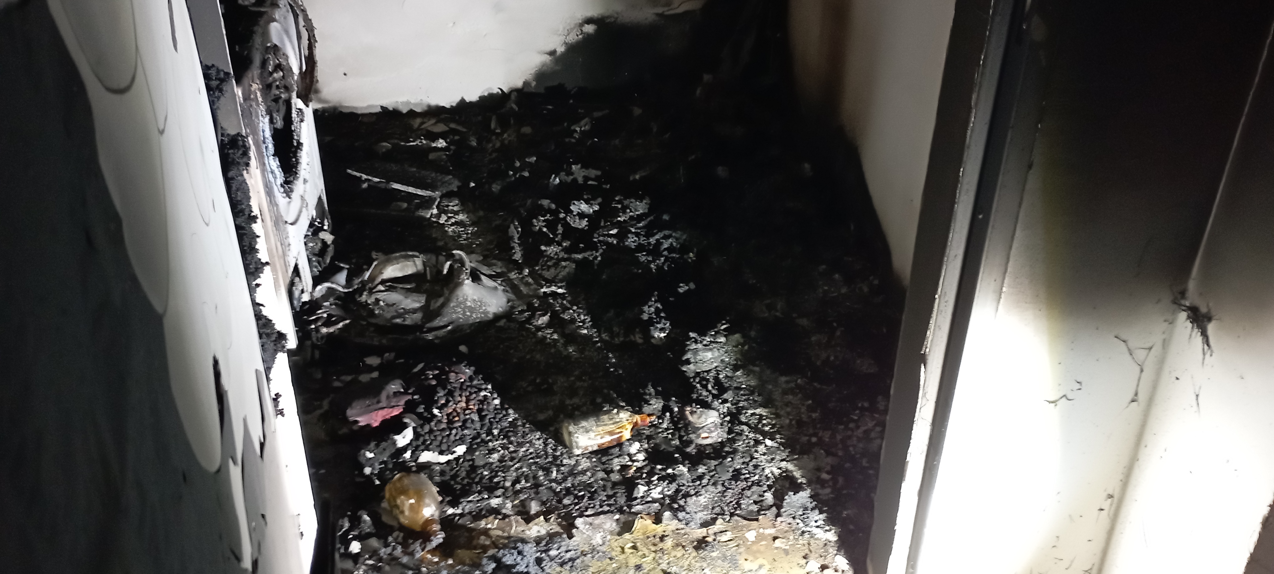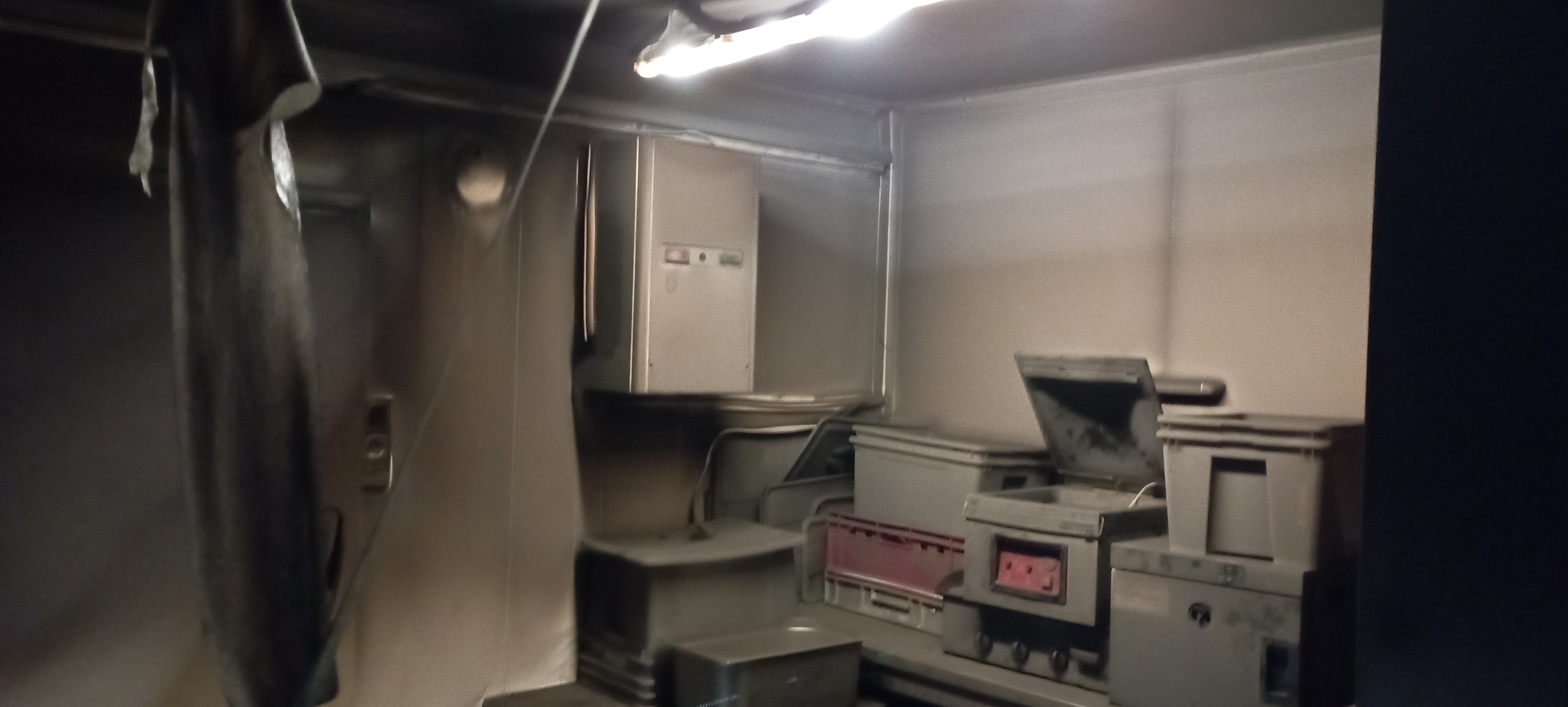 Nach Erkundung der stark verrußten Küche durch den Einsatzleiter konnte der vermutliche Brandherd in einer Abstellkammer festgestellt werden. Mittels Wärmebildkamera wurden die Glutnestern lokalisiert und durch Einsatz eines Schaumlöschers gelöscht. Die Reste der Glutnester wurden mit einer Fassschaufel entfernt und im Außenbereich sicher abgestellt.