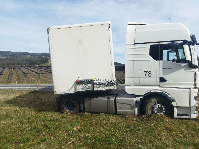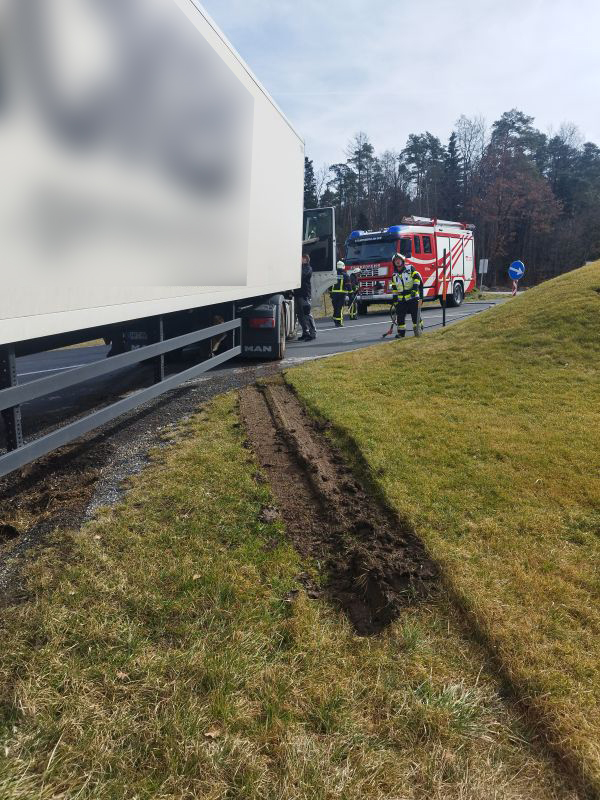 Ein Sattelzug war beim Wenden in einer Wiese stecken geblieben und musste mit der Seilwinde des RLF geborgen werden.