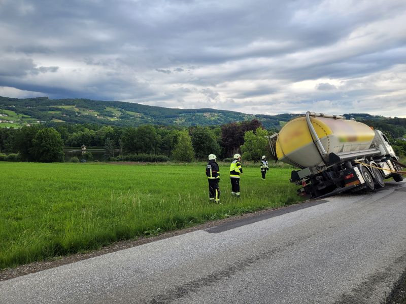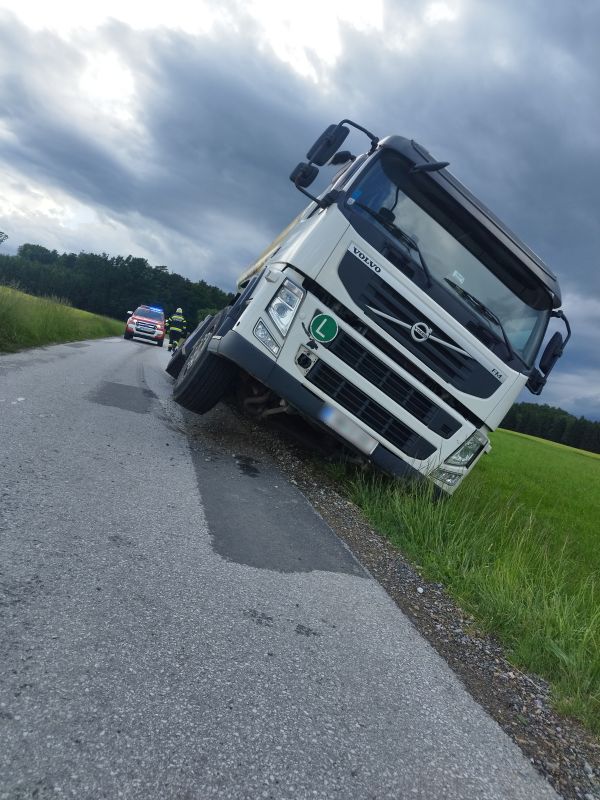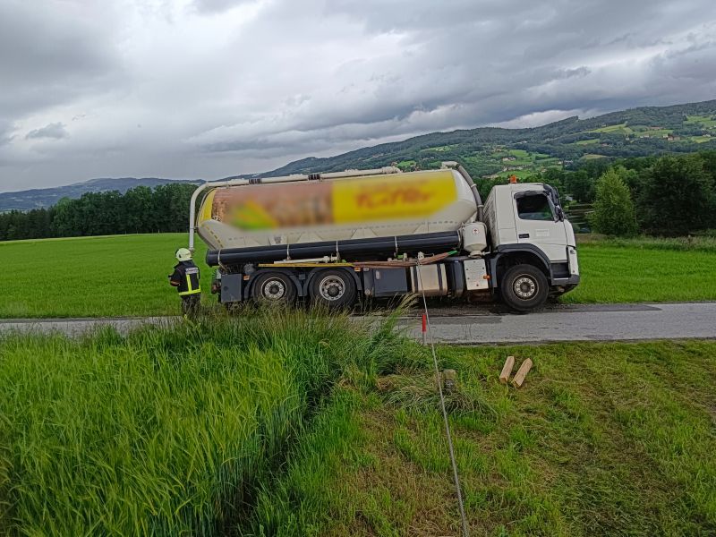 Ein Futtertransporter war beim auf das Bankett geraten und daraufhin abgerutscht und im Straßengraben stecken geblieben.
