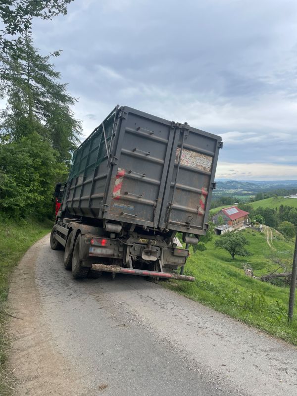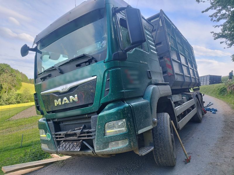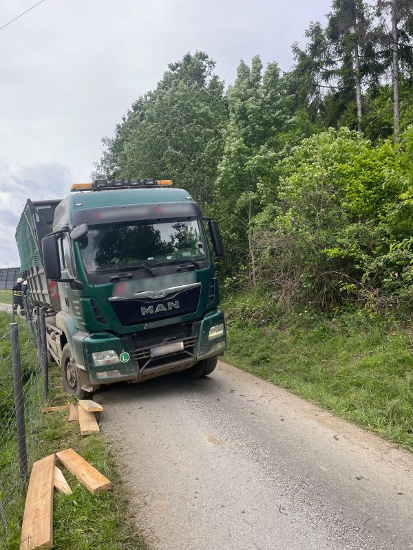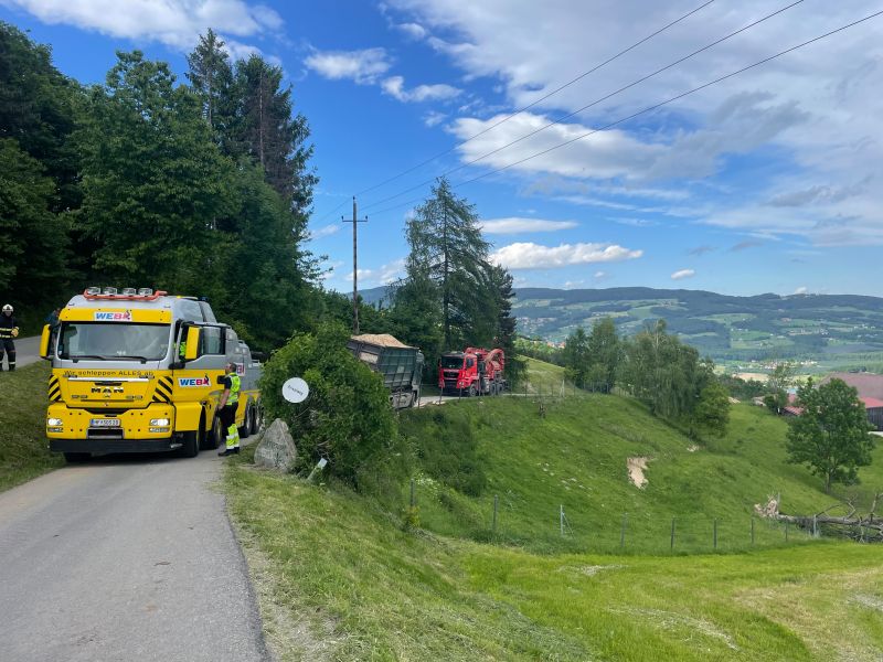 Ein Hackschnitzeltransporter war auf einer schmalen Straße von der Fahrbahn abgekommen und drohte über eine Böschung zu kippen.