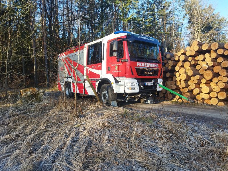 Ein Holztransporter war bei einem Wendemanöver in einer Wiese stecken geblieben und musste mittels Seilwinde des LKW-A geborgen werden.