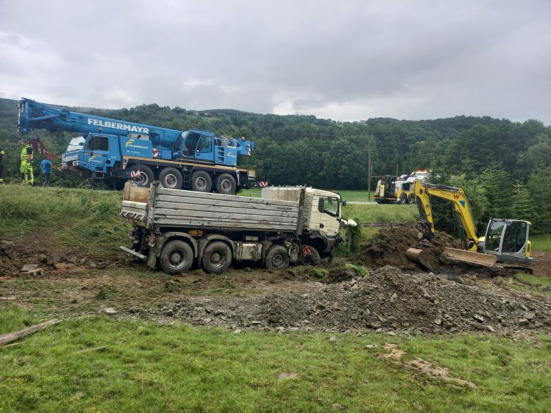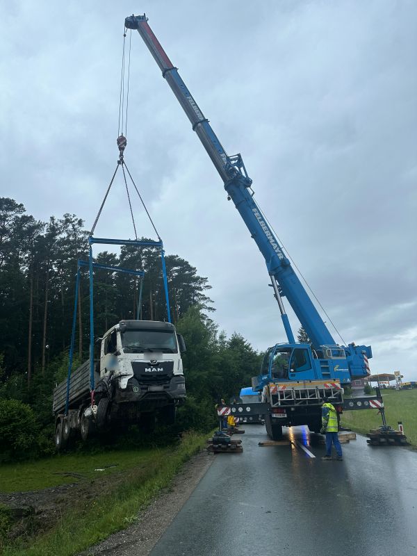Für die Bergung des Fahrzeugs waren umfangreiche Maßnahmen erforderlich, darunter der Einsatz einer Seilwinde, eines Schwerlast-Abschleppfahrzeuges und eines Mobilkrans. Während der Bergungsarbeiten musste die Straße vollständig gesperrt werden.