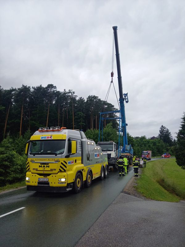 Am 03.06.2024 wurde die Freiwillige Feuerwehr Stubenberg zu einer LKW Bergung auf der L414 in Fahrtrichtung Tiefenbach gerufen.