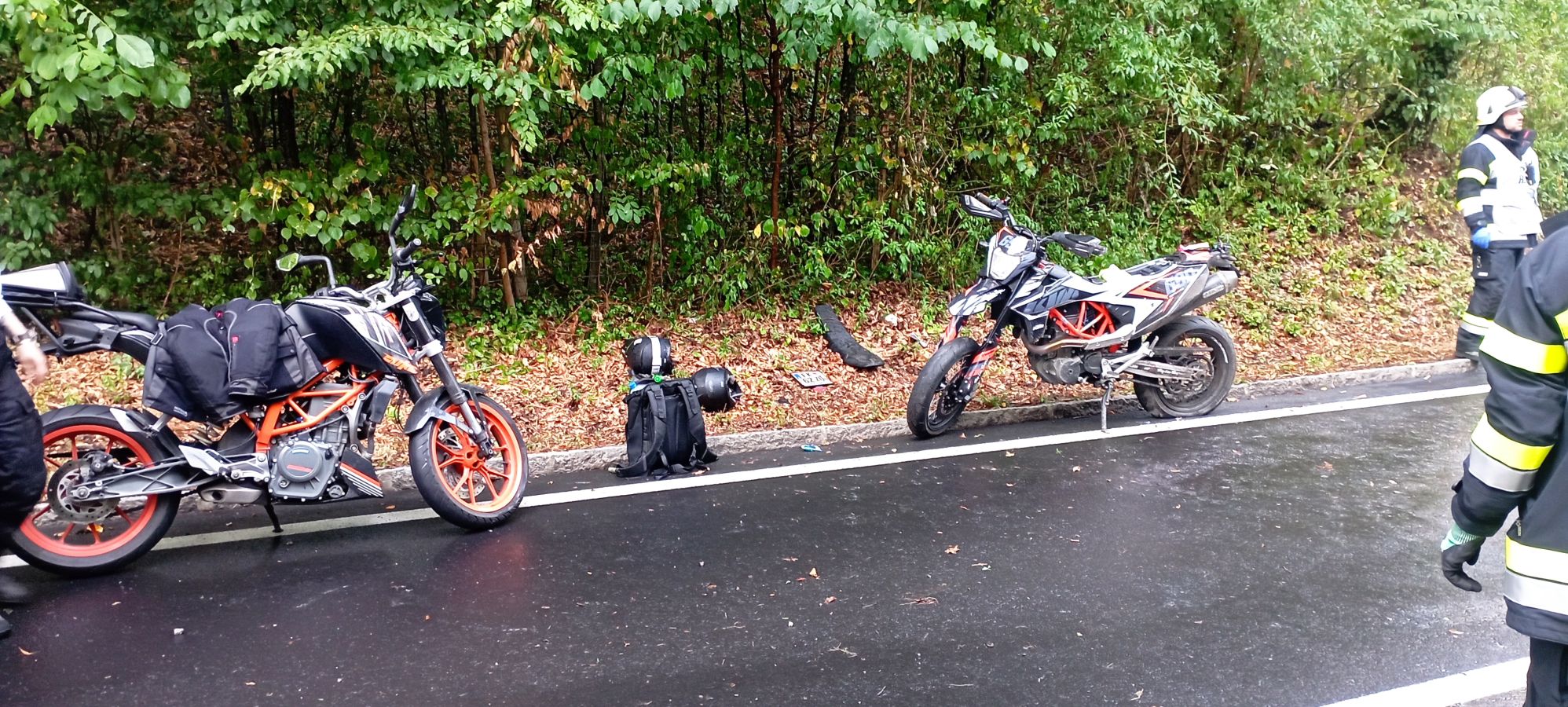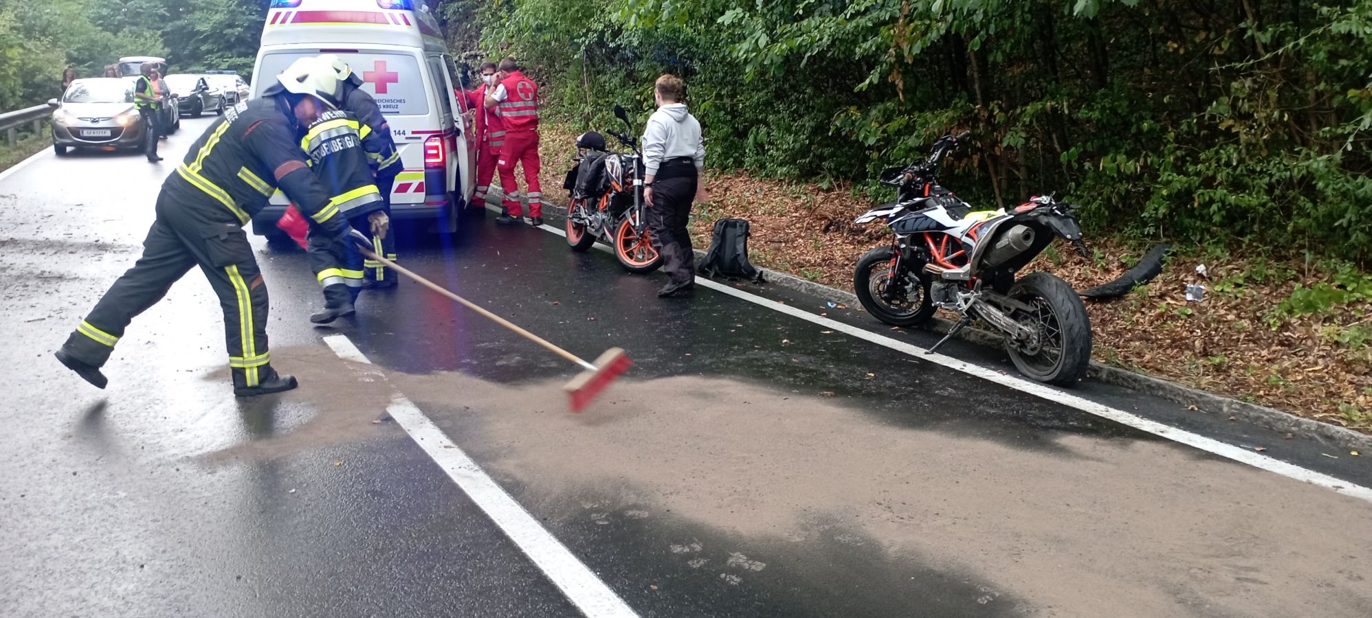 Ein Motorradfahrer war in einer Kurve auf der regennassen Fahrbahn gestürzt und mit dem Motorrad gegen die Leitplanke geprallt. Der Fahrer des Motorrads wurde der Rettung übergeben, die ihn zur Kontrolle auf Verletzungen ins Spital brachte. Das Motorrad wurde von den Kameraden der Feuerwehr von der Fahrbahn entfernt und das ausgelaufene Betriebsmittel gebunden.