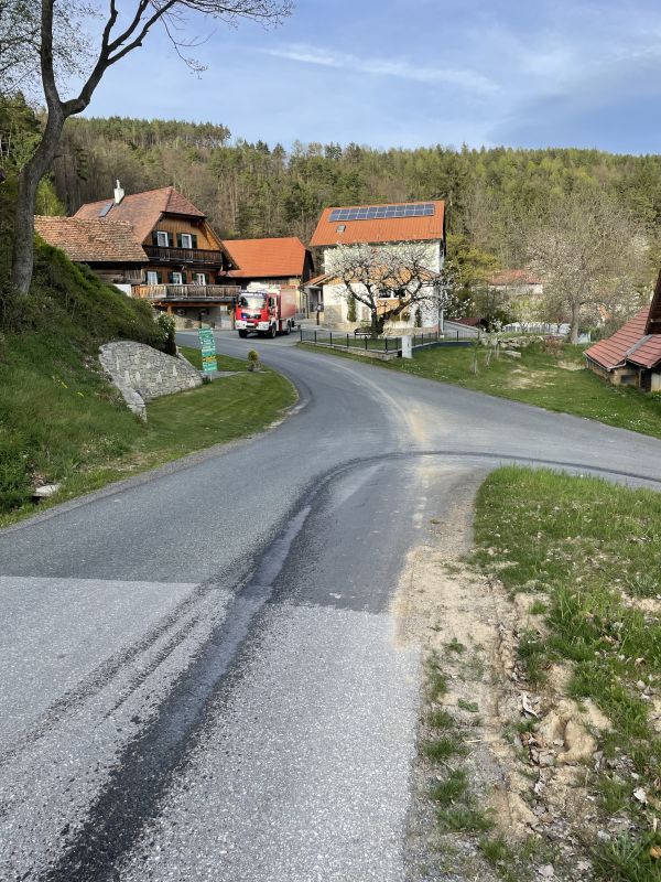 Ein defekter Hydraulikschlauch war die Ursache für eine ca. 200m lange Ölspur. Nach kurzer Einsatzdauer könnte das ausgetretene Öl gebunden und Folgeschäden vermieden werden.