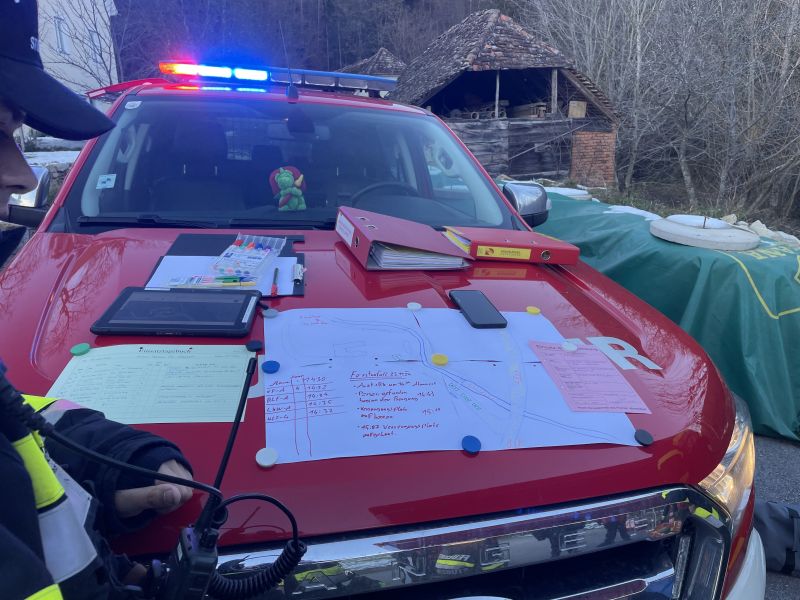 Die verunfallte Person musste unter Einsatz der MRAS-Ausrüstung am Unfallort erstversorgt und anschließend gerettet werden. Unterdessen wurde auf einer benachbarten Wiese ein gesicherter Bereich für die weitere Versorgung des Verletzten aufgebaut.