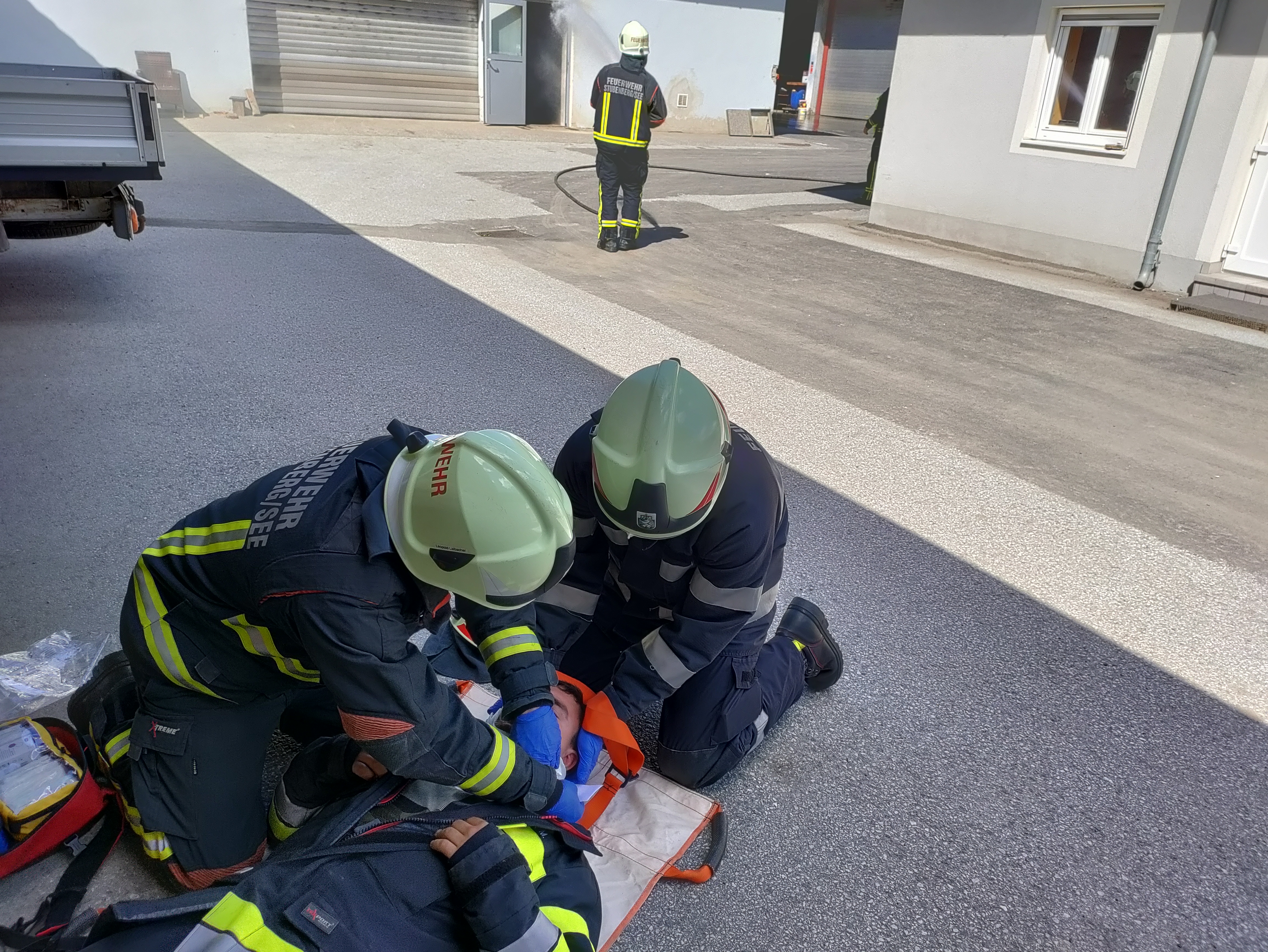 Nach Eintreffen der Einsatzleitung und taktischer Positionierung der Fahrzeuge wurde der Atemschutztrupp vom RLF-A aus zur Personenrettung in die Werkstatt befohlen. Zeitglich stellte die Mannschaft des RLF-A und HLF 4 den Brandschutz für die umliegenden Gebäude sicher.